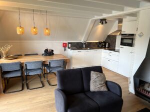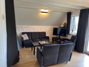 De ruime woonkamer heeft een 3-, 2- en een 1 zits bank en een grote tafel van 2 meter met 6 stoelen om spelletjes te kunnen spelen of om uitgebreid te kunnen dineren.